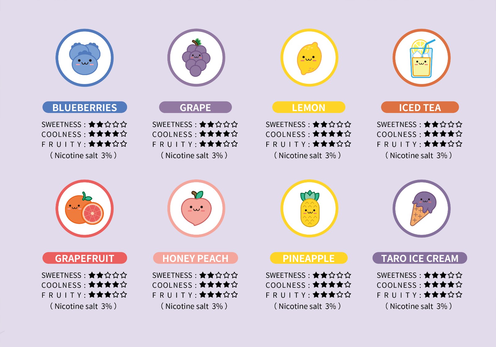 相機(冰紅茶)/錄音帶(葡萄)/老虎機(藍莓)/遊戲機(檸檬、西柚、蜜桃、菠蘿、香芋冰淇淋)