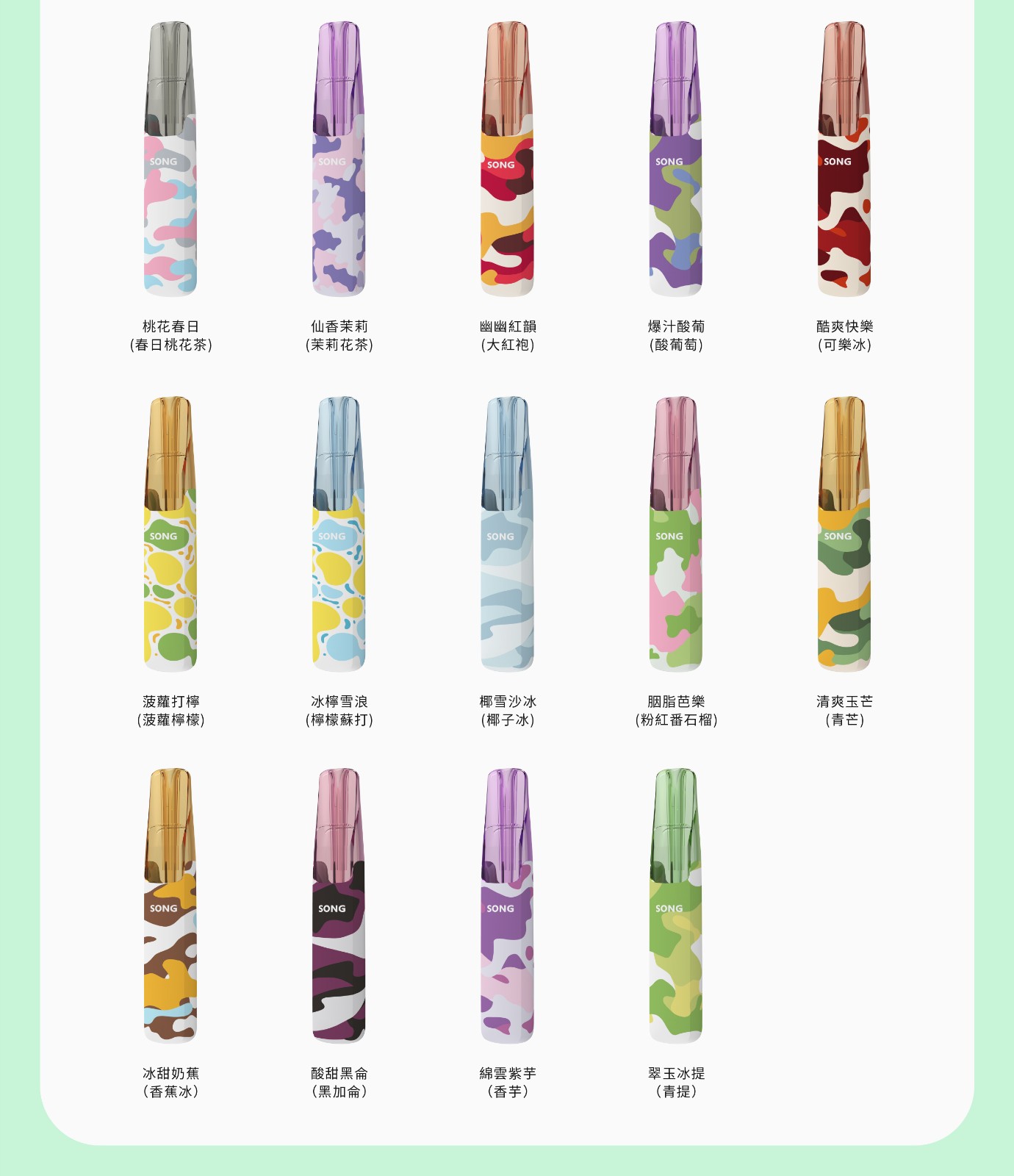 雨前冷翠/ 玫妃笑/ 爆汁麒麟瓜/ 冰鋒暗影/ 幽幽紅韻/百香蜜柚/ 春日桃花茶 / 仙香茉莉/爆汁酸葡/ 酷爽檸檬/ 鳳梨打檸/冰柠雪浪/ 椰雪沙冰/ 胭脂芭乐/ 清爽玉芒/冰甜奶蕉/酸甜黑侖/ 绵云紫芋/ 翠玉冰提