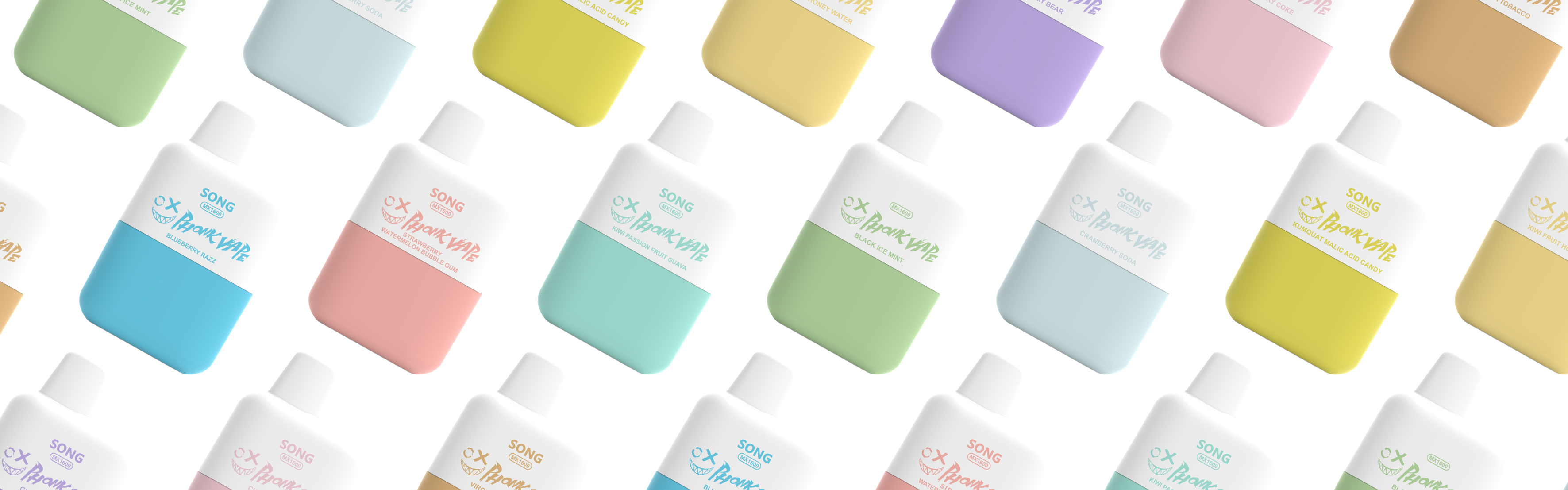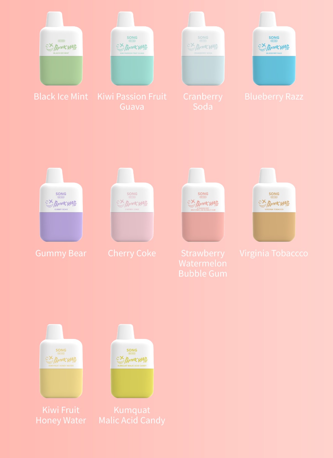 黑冰薄荷/奇異果百香果番石榴/蔓越莓蘇打水/蓝莓拉兹/小熊軟糖/樱桃可樂/草莓西瓜泡泡糖/佛吉尼亞煙草/奇異果蜂蜜水/金橘蘋果酸糖