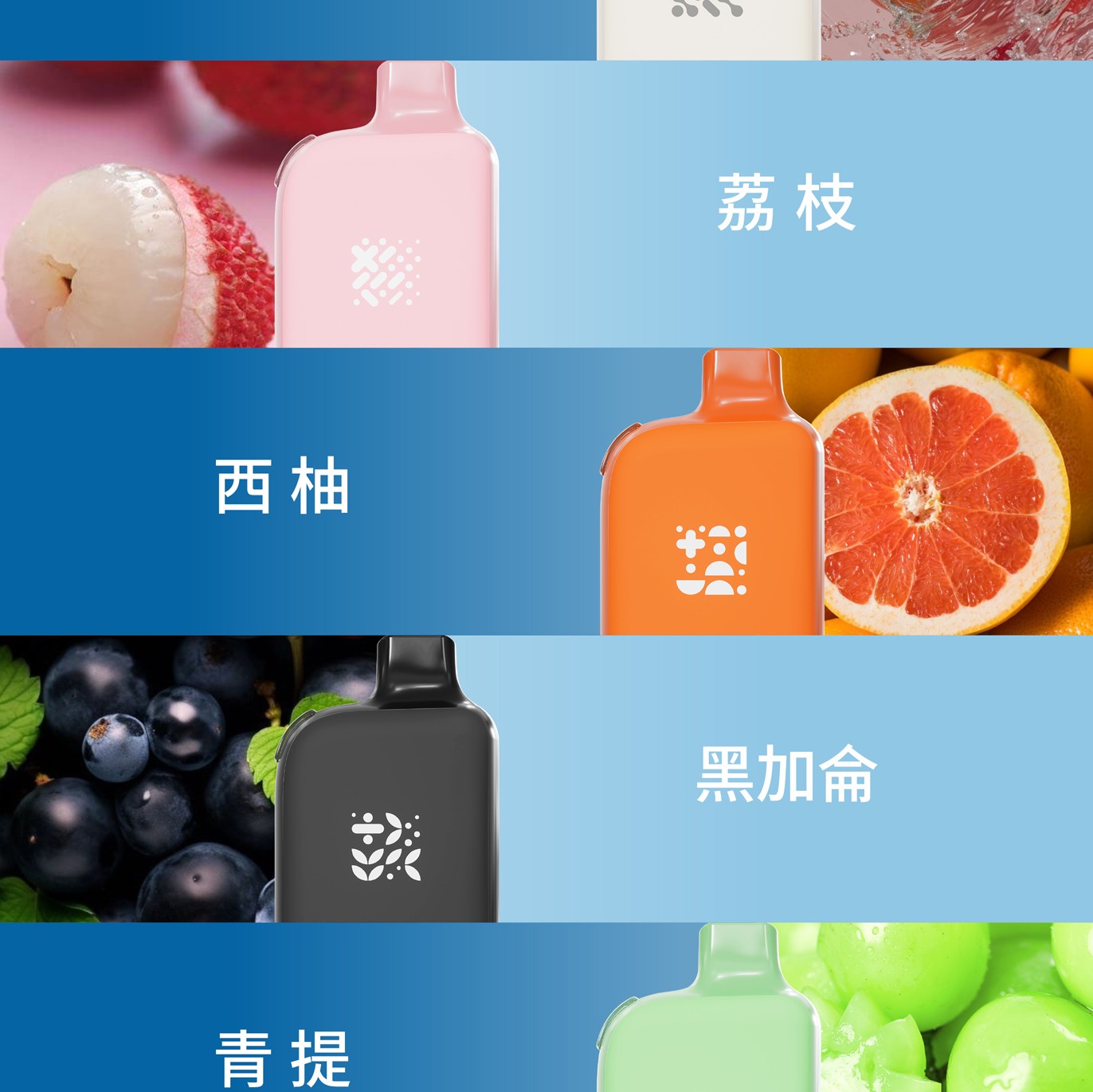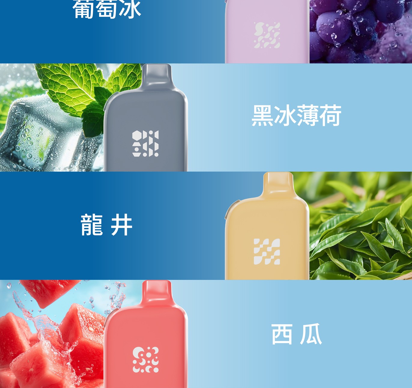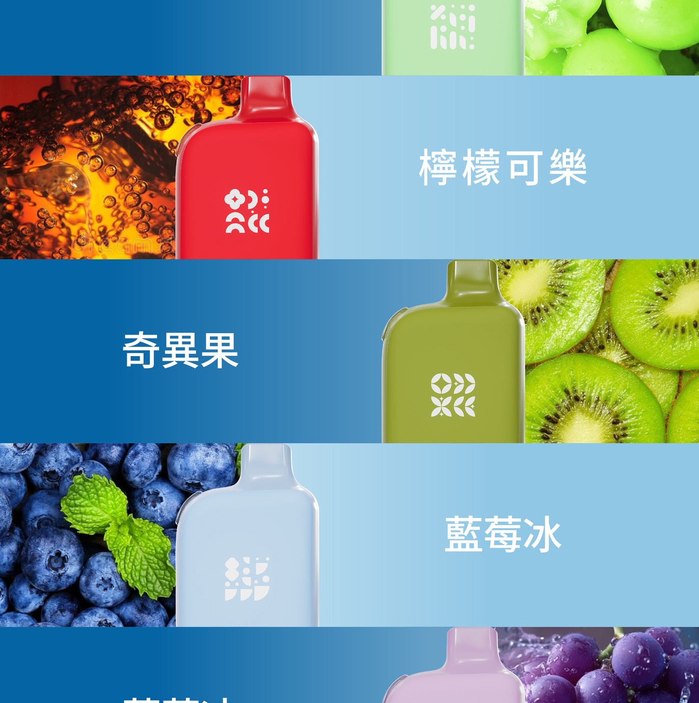白桃烏龍/荔枝/西柚/黑加侖/青葡/檸檬可樂/奇异果/藍莓/葡萄/西瓜/黑冰薄荷/龍井茶