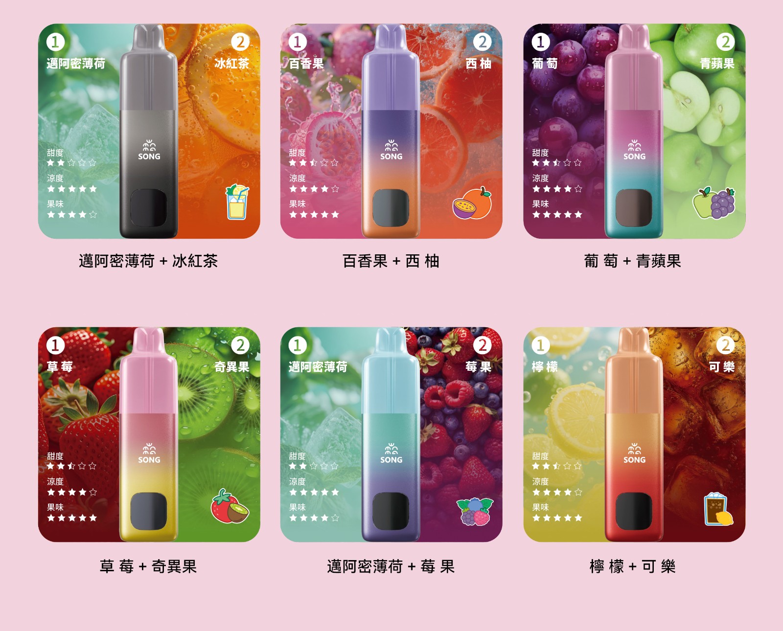荔枝+黑加侖/ 青提+龍井茶/ 草莓+西瓜/ 檸檬+鳳梨/蜜桃+龍井茶/ 話梅+七喜/ 邁阿密薄荷+冰紅茶/ 百香果+西柚/ 葡萄+青蘋果/ 草莓+奇異果/ 邁阿密薄荷+莓果/ 檸檬+可樂